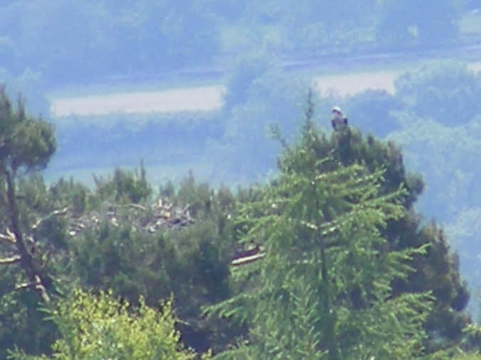 A distant view of an adult Osprey at Bassenthwaite, close to the nest in use in 2010. The Osprey is sitting on the top of a tree just to the right of the large flat nest.