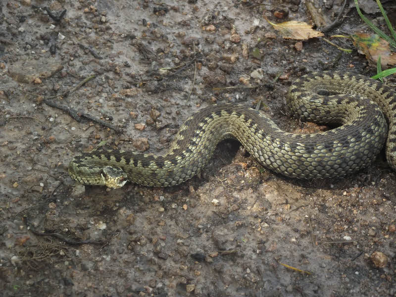 View of an adder disturbed while crossing a path on Muncaster Fell. In this shot the adder is in the familiar curved shape, but it straightened out to move off.