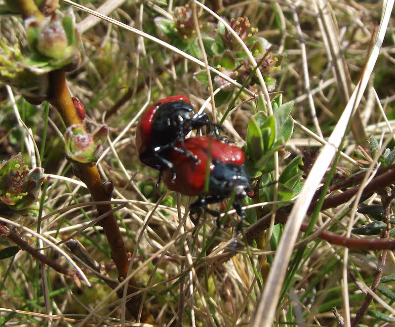 Front view of a pair of Poplar Leaf Beetles mating on Drigg Dunes.