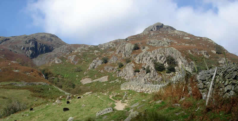 The view towards Pike Howe (right) and Mark Gate (left) from the lower slopes of the Langdale Pikes, with the summit of Harrison Stickle visible over the top of Mark Gate. The path to the summit, which is visible in the centre of the picture, then runs off the left hand side of this picture.